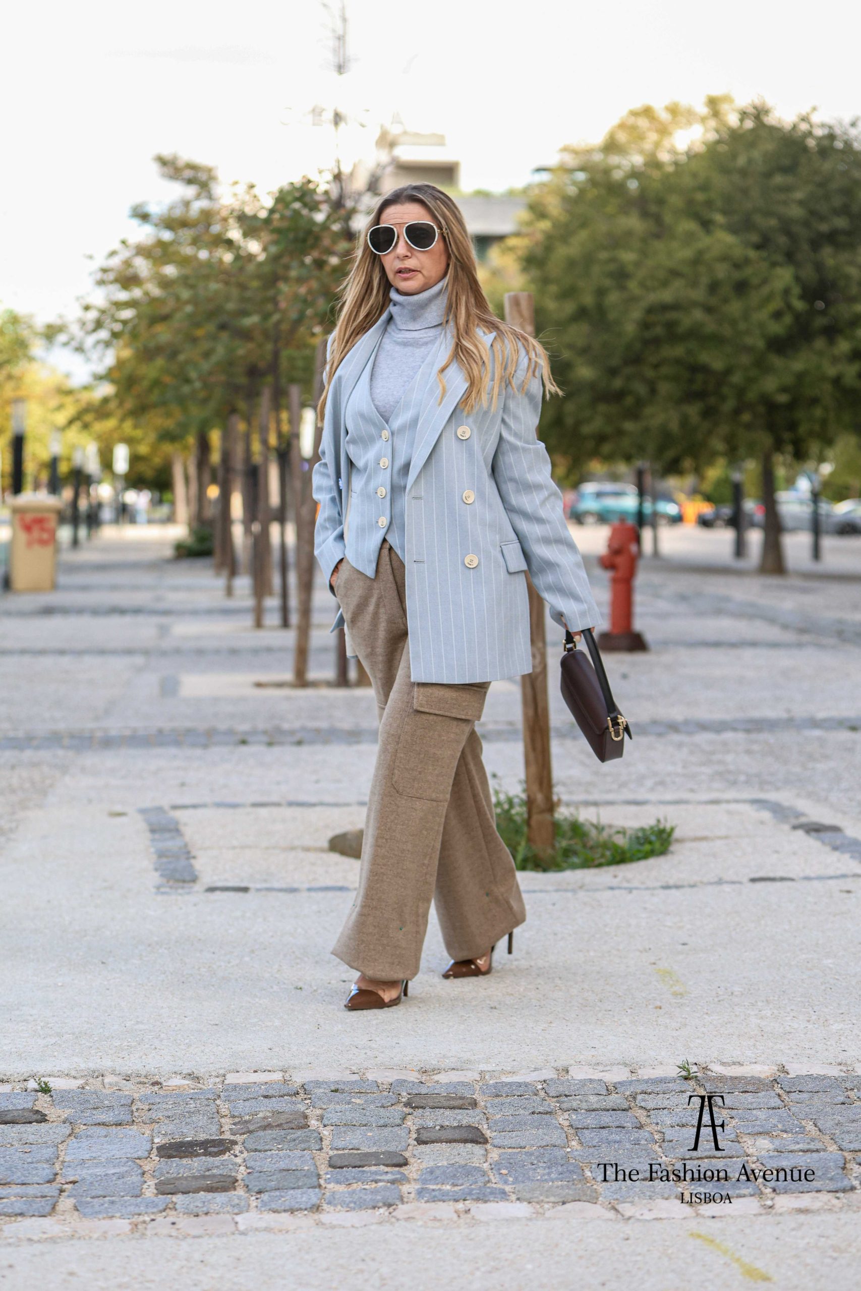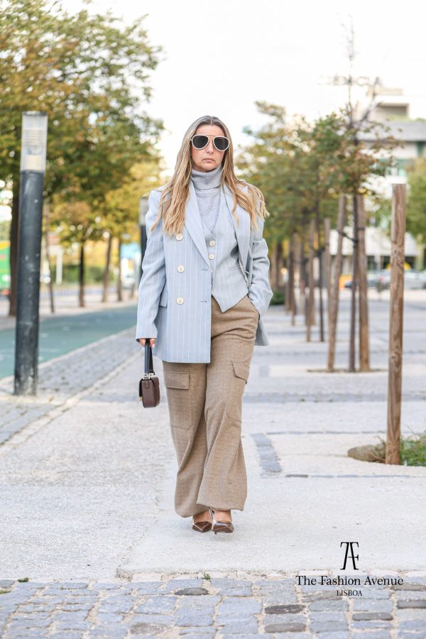 Blazer da marca Josh V, em azul céu, com risca fina branca. Existe colete no mesmo tom e padrão.