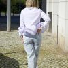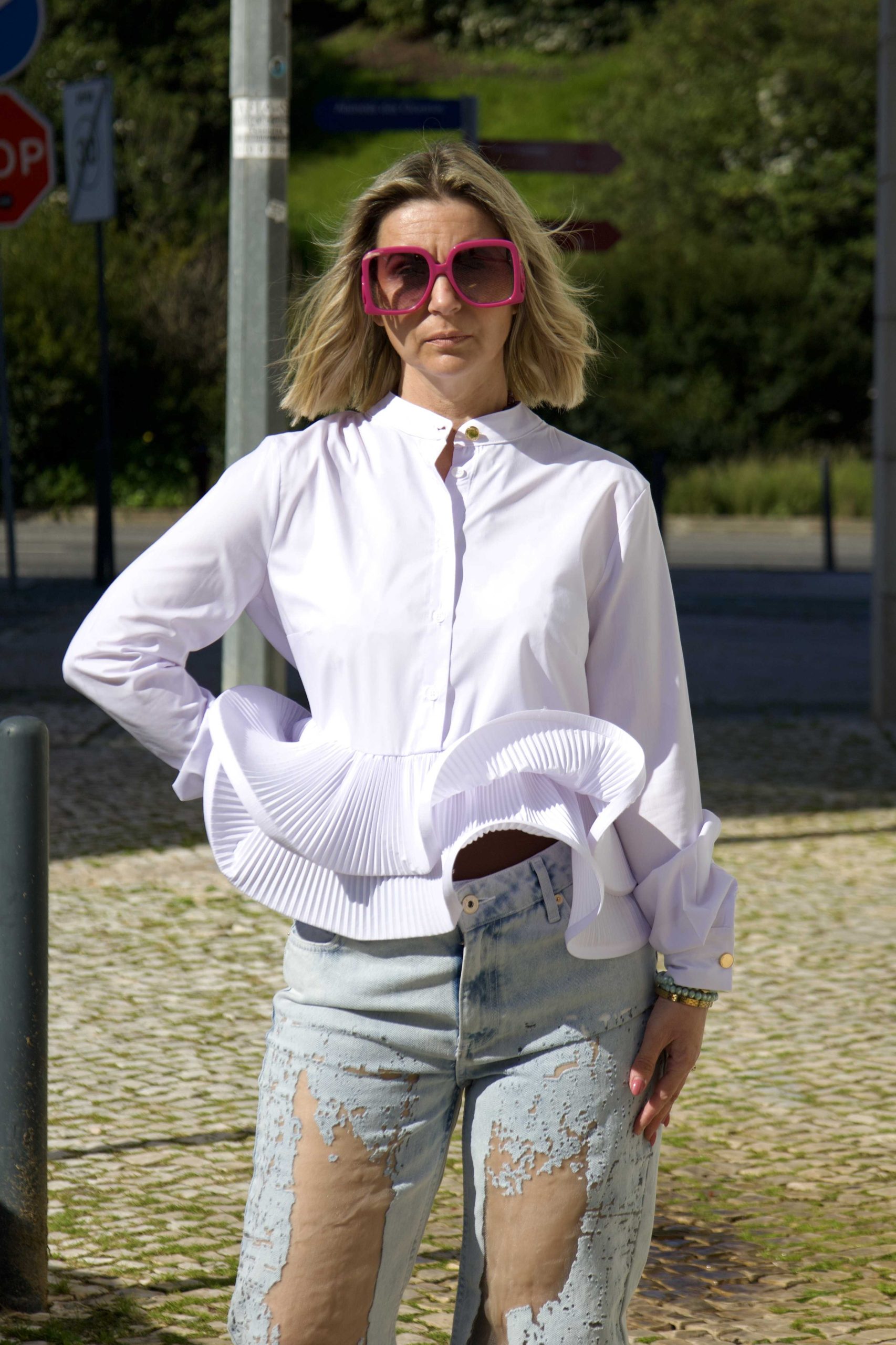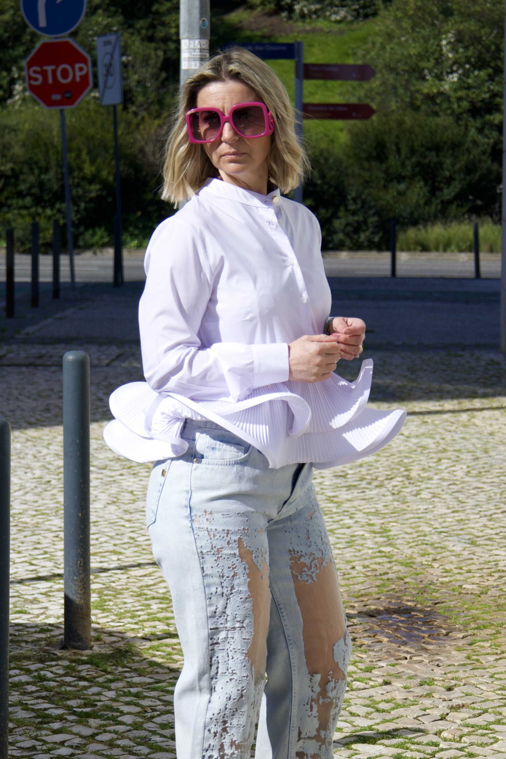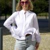 Camisa da marca Fracomina, tom branco com folhos a partir da cintura.